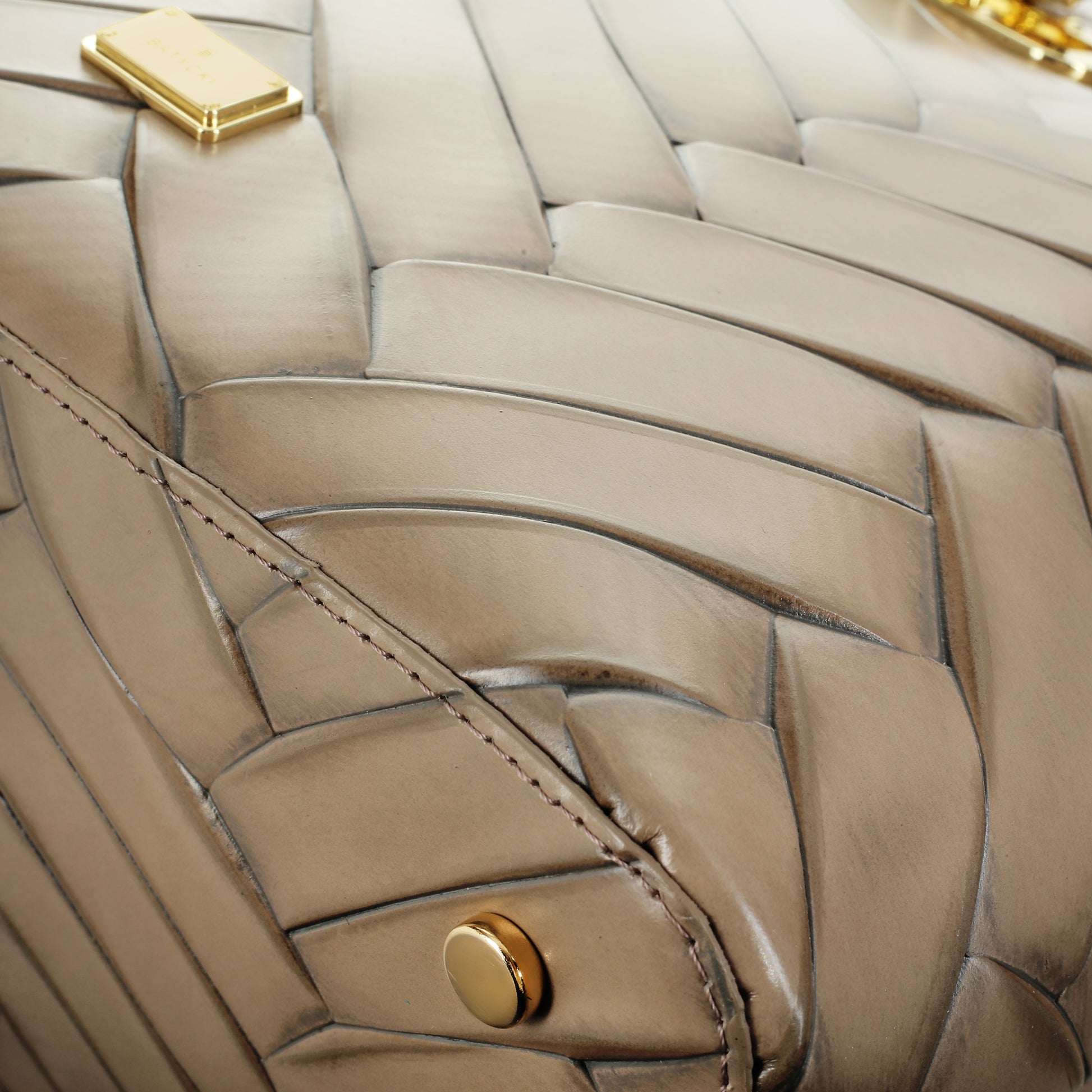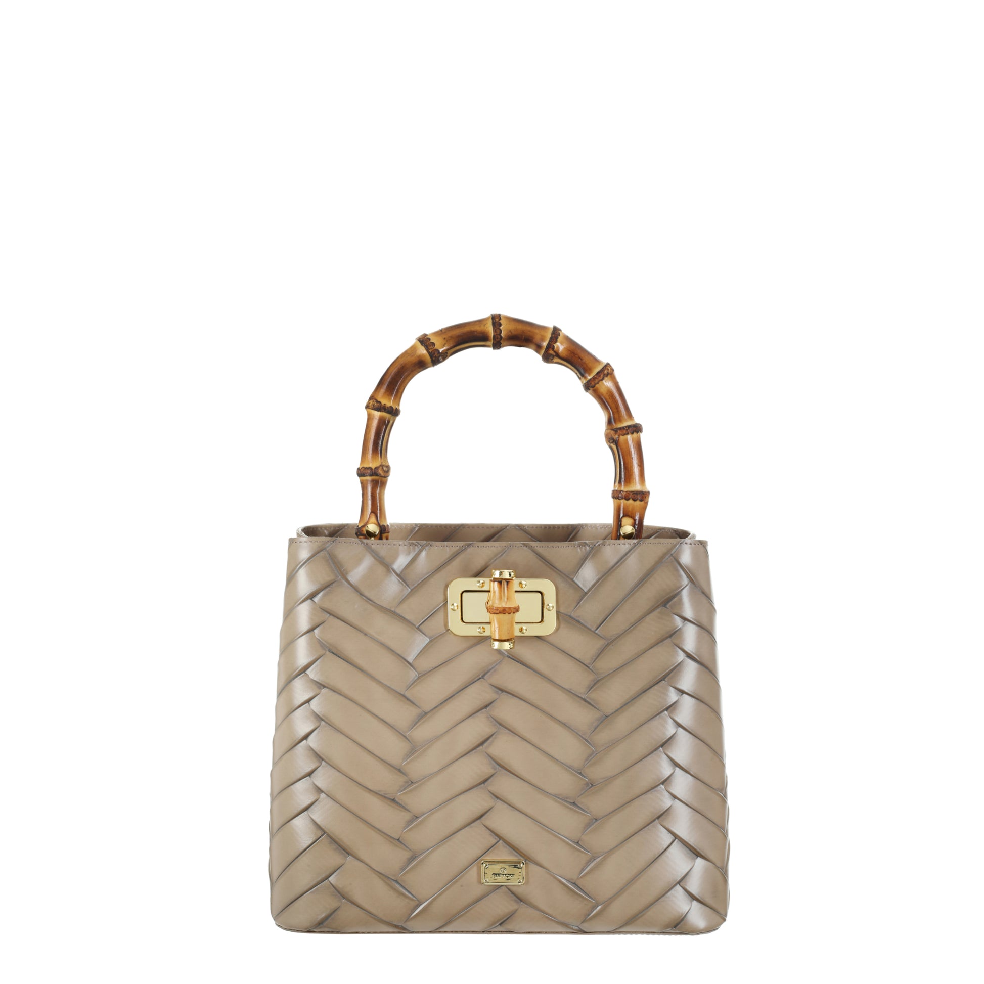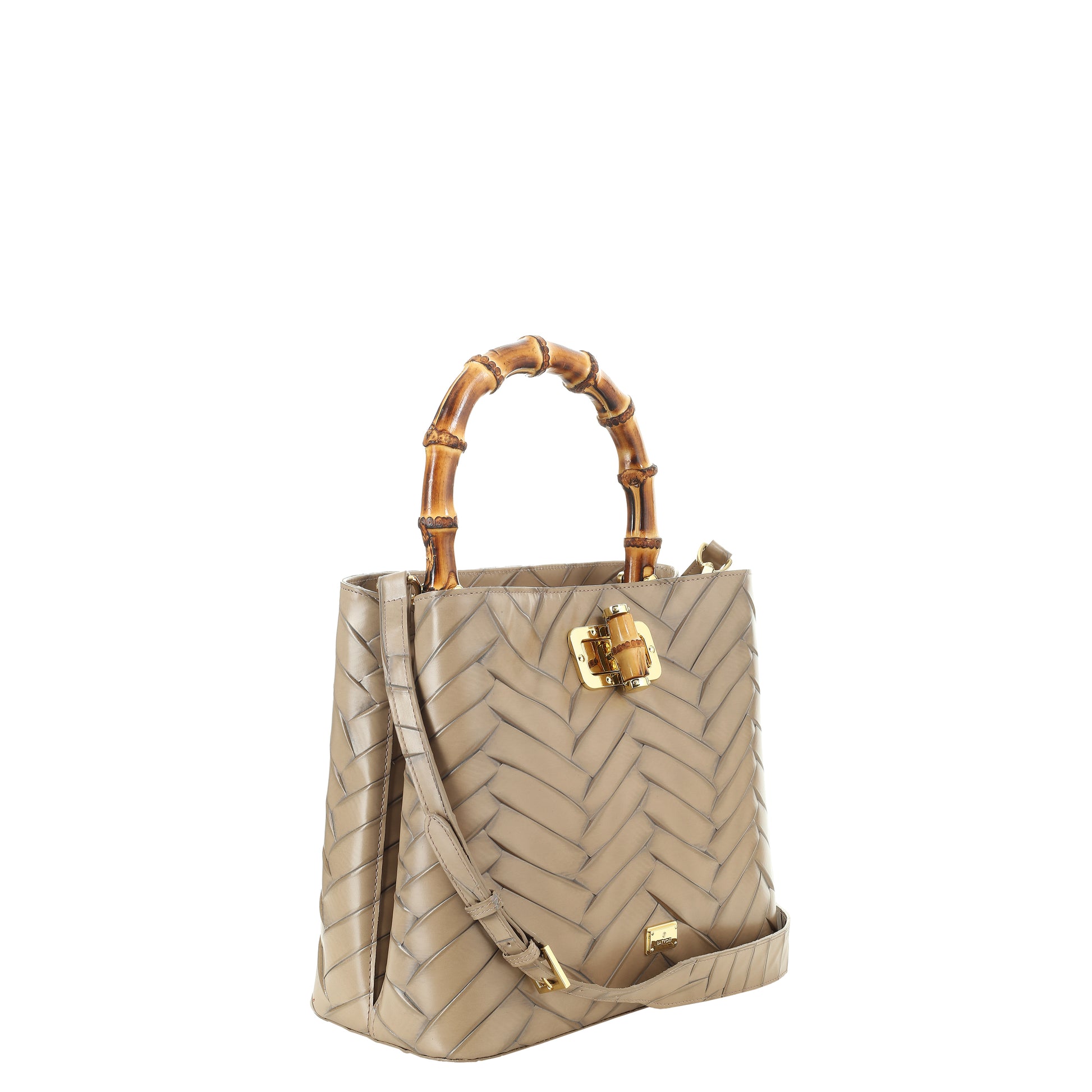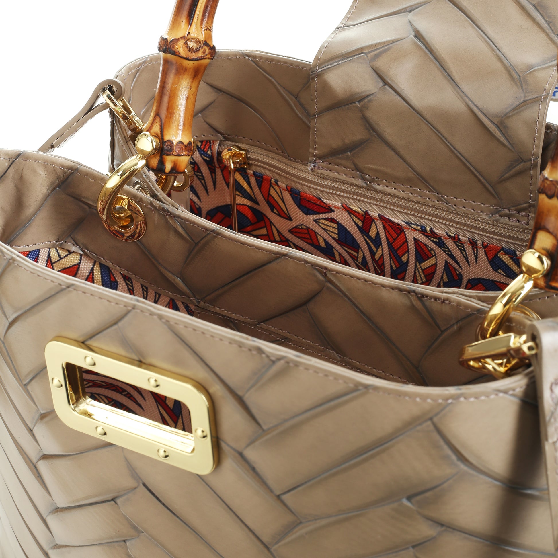 Stella-Handtasche aus Naturleder, für uns von italienischen Gerbereimeistern angefertigt. Es verfügt über zwei Fächer und drei Taschen, darunter eine mit Reißverschluss. Es ist mit einem äußerst funktionellen Schlüsselanhänger ausgestattet. Wird mit einer dekorativen Drehung mit einem Bambuselement befestigt, das zum attraktiven Bambusgriff passt. Es ist äußerst elegant und praktisch und wird Ihnen jeden Tag das Gefühl geben, etwas Besonderes zu sein.