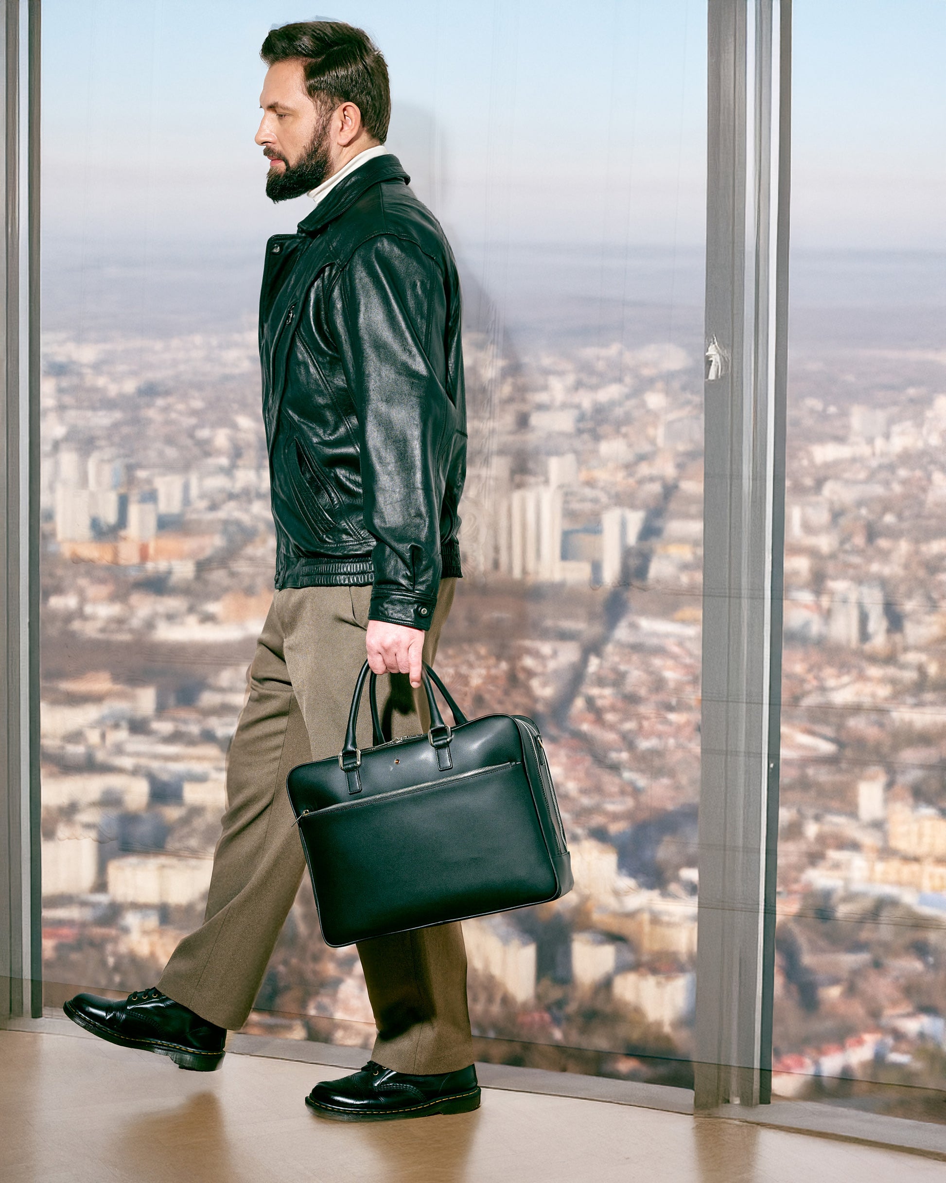 Laptop bag with zipper. It has two compartments and an adjustable shoulder strap. A convenient compartment at the front. There are two pockets inside, including one with a zipper. Original design, perfect for everyday use. Created for modern men.