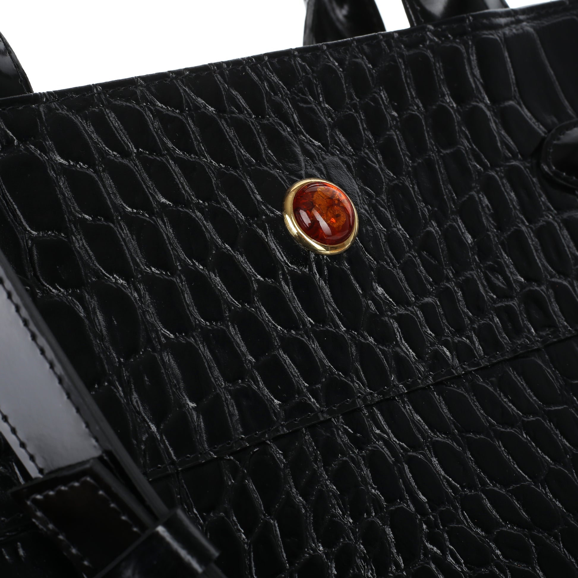 Torebka sygnowana jest dużym bursztynowym oczkiem w oprawie z rodowanego srebra pokrytej 24-karatowym złotem.