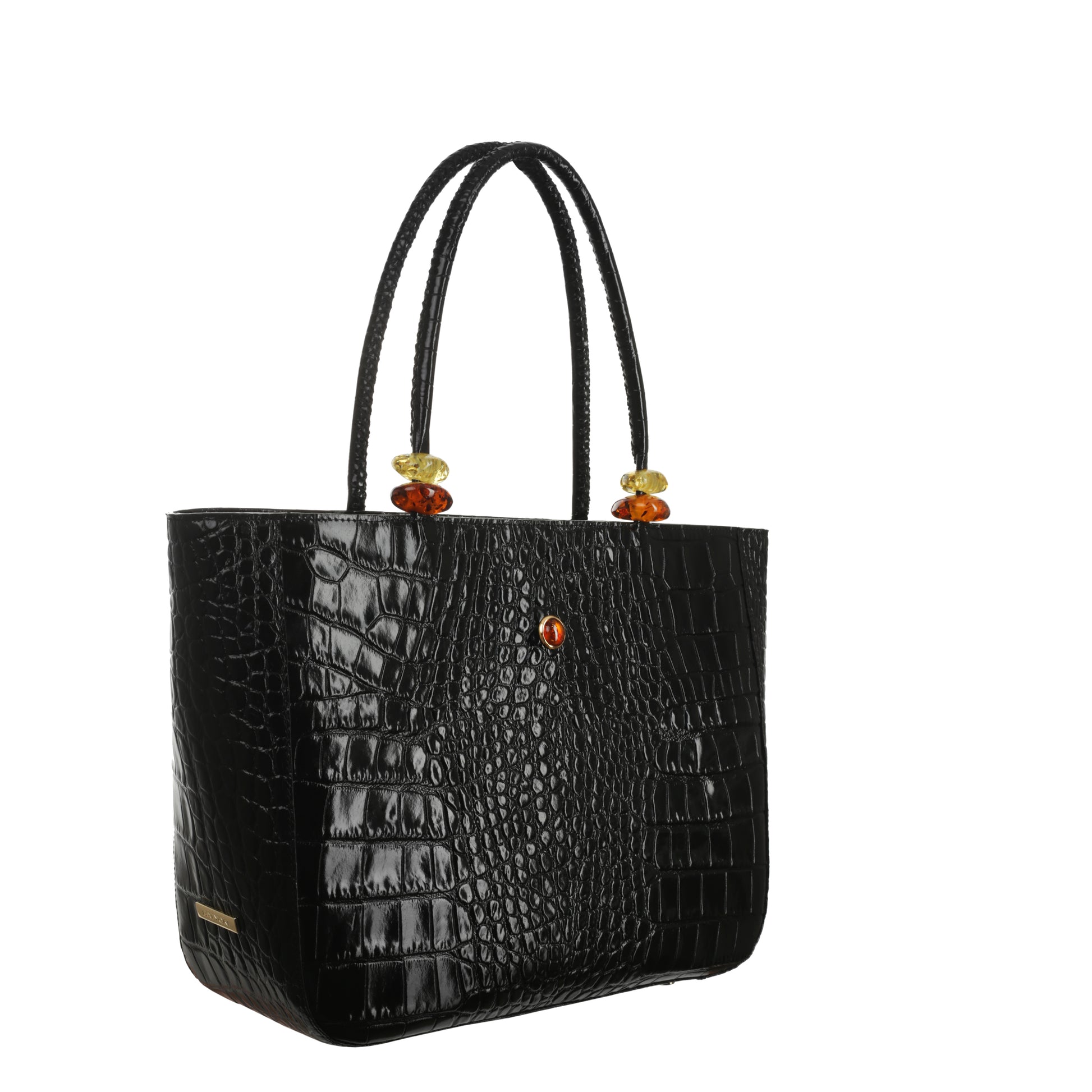 Torebka sygnowana jest dużym oczkiem bursztynowym w oprawie pozłacanej 24-karatowym złotem oraz blaszką ze znakiem BATYCKI.