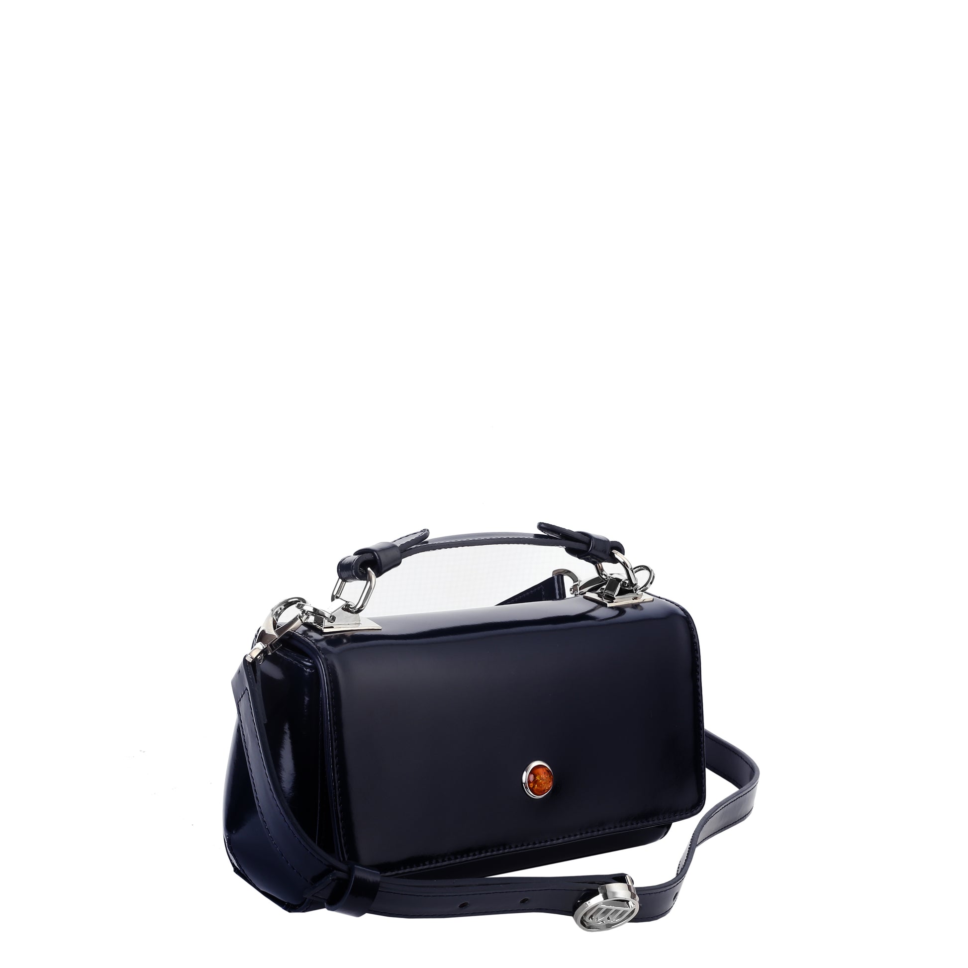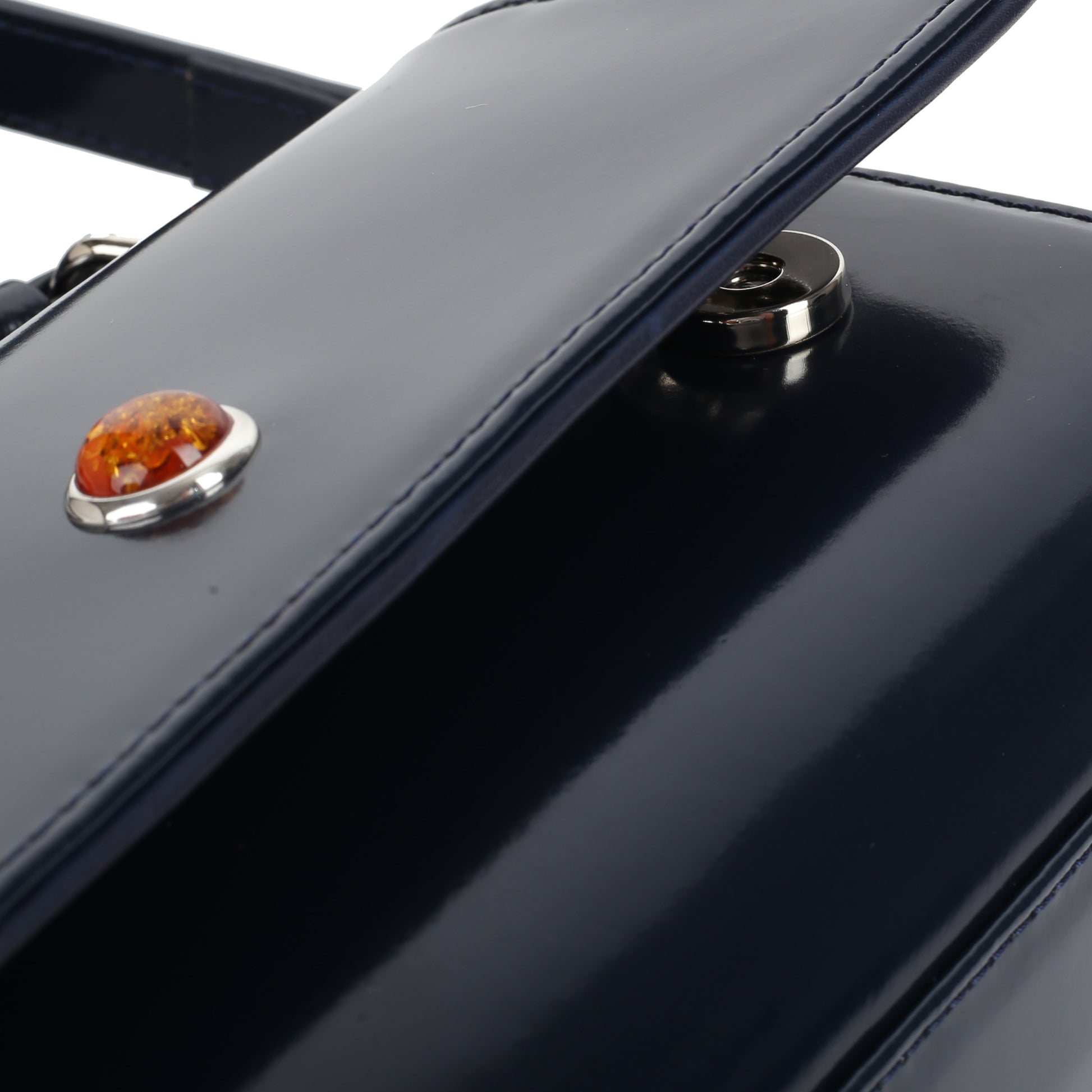 Torebka sygnowana jest dużym bursztynowym oczkiem w oprawie pokrytej 24-karatowym złotem.