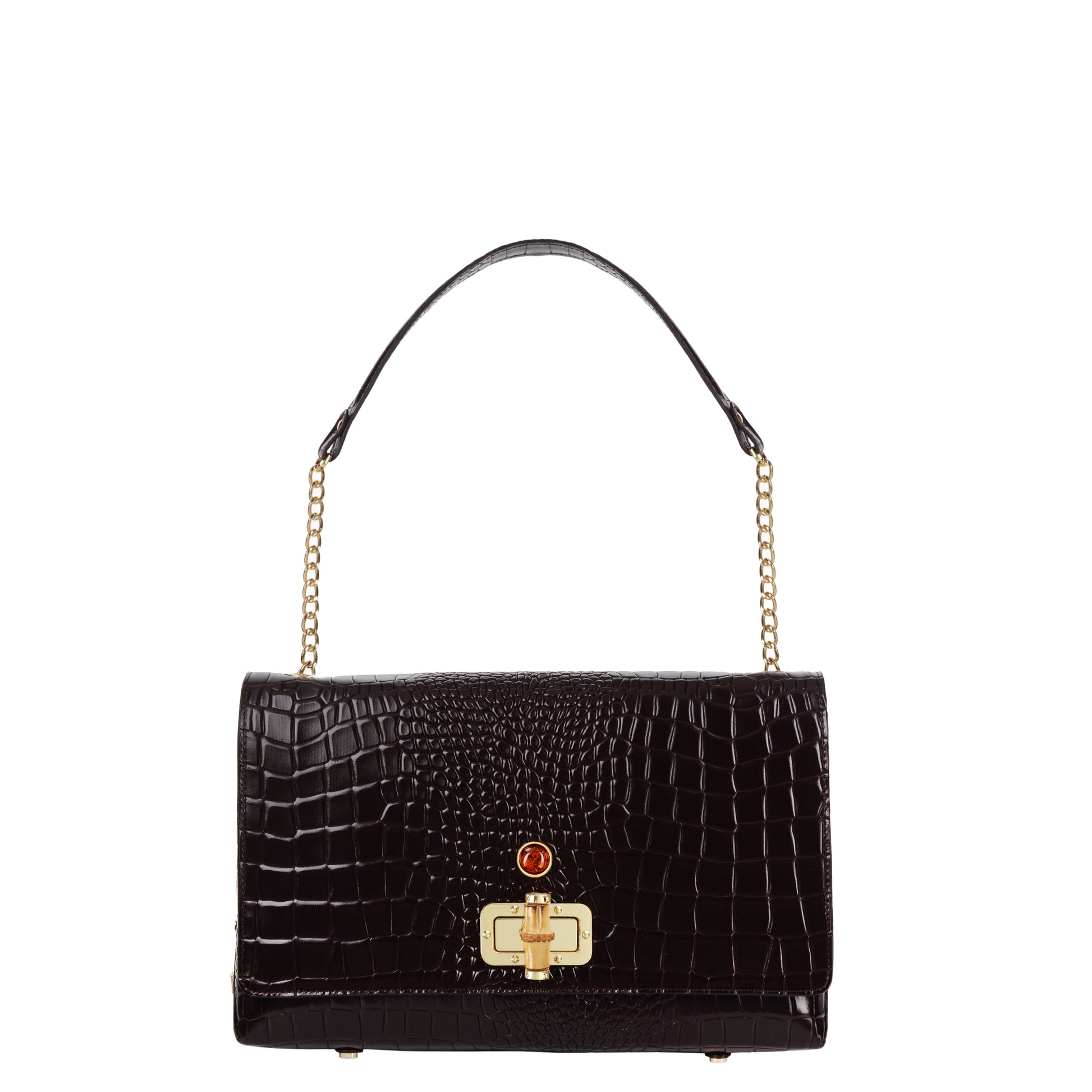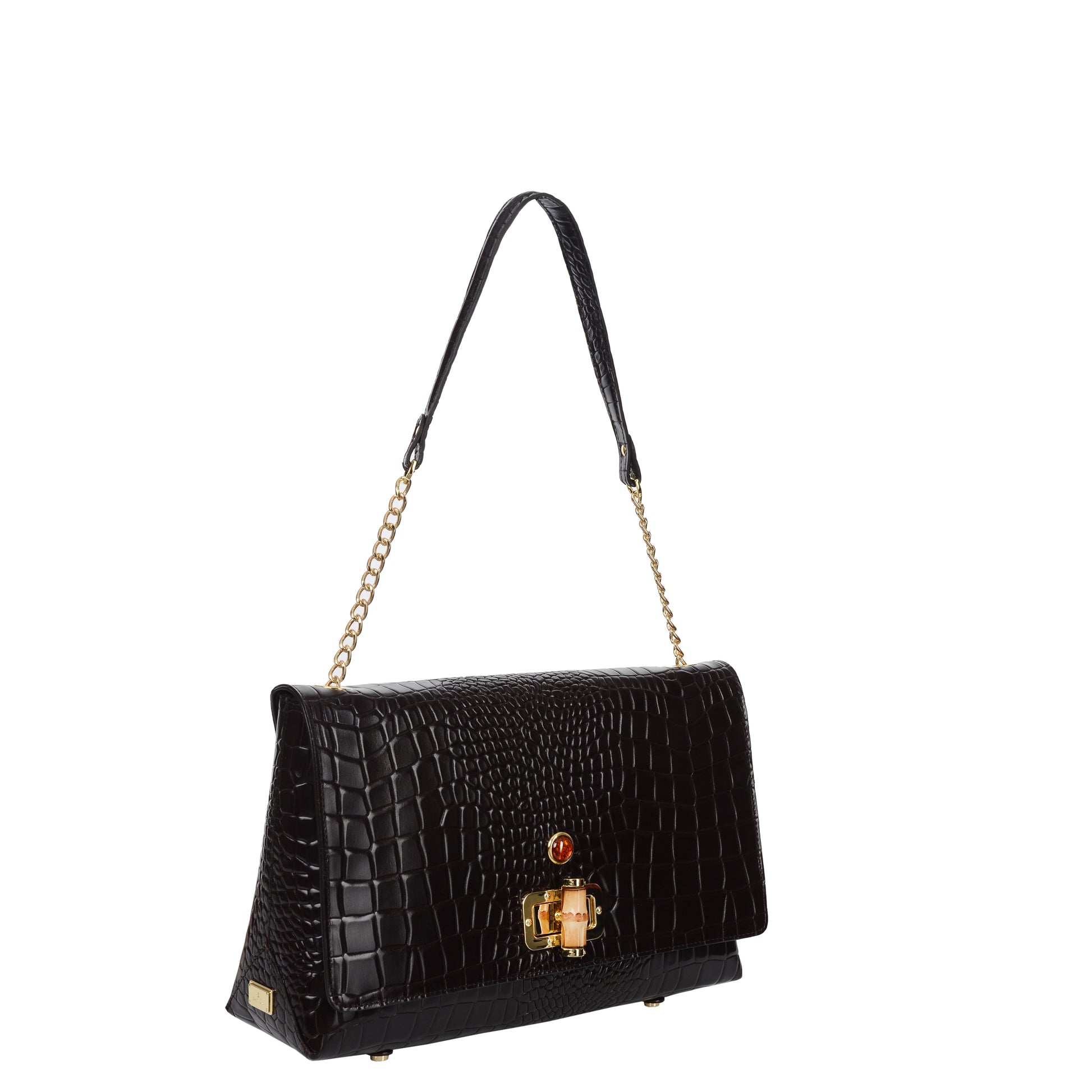 Torebka sygnowana jest dużym bursztynowym oczkiem w oprawie pokrytej 24-karatowym złotem oraz blaszką ze znakiem BATYCKI.