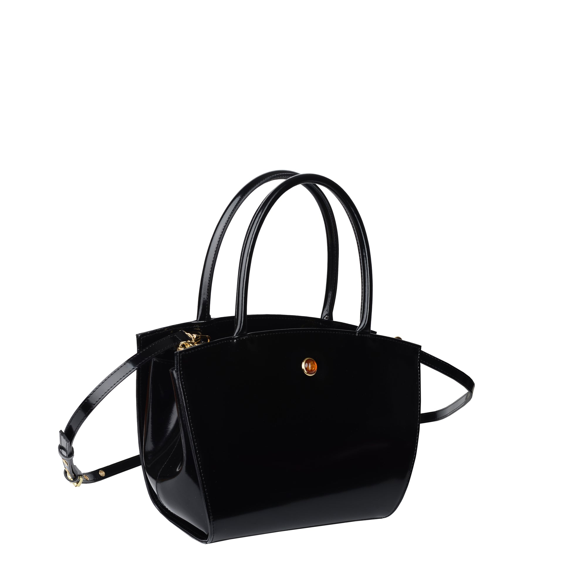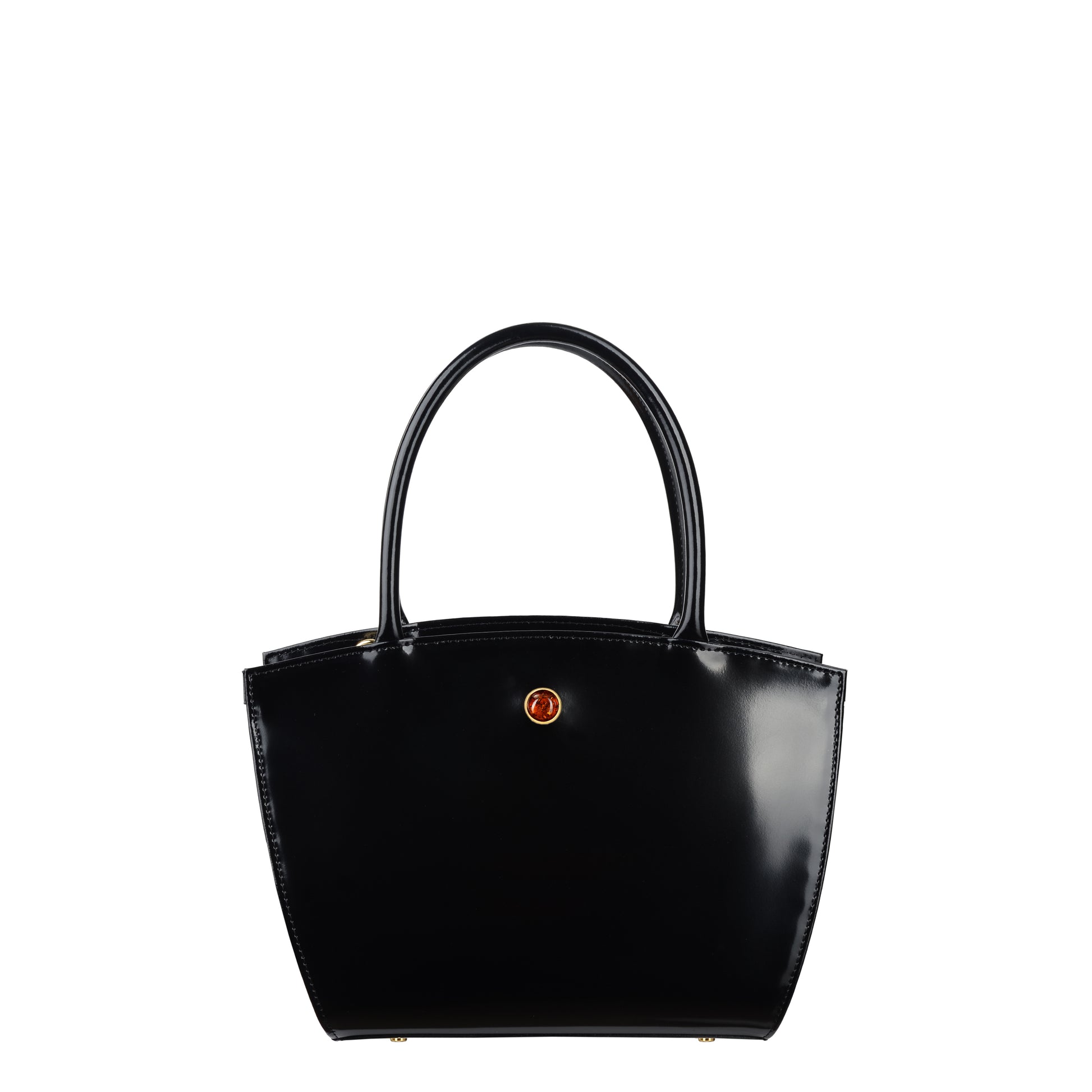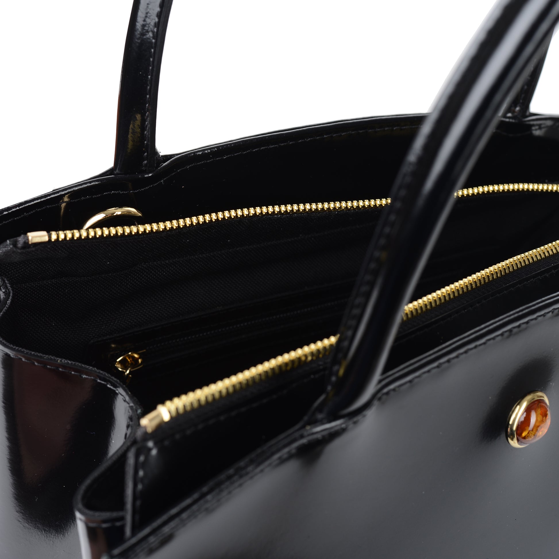 Torebka sygnowana jest dużym bursztynowym oczkiem w oprawie pokrytej 24-karatowym złotem.